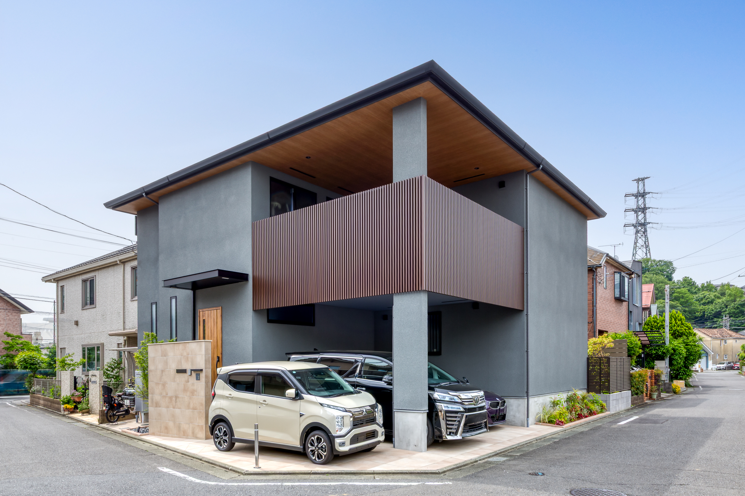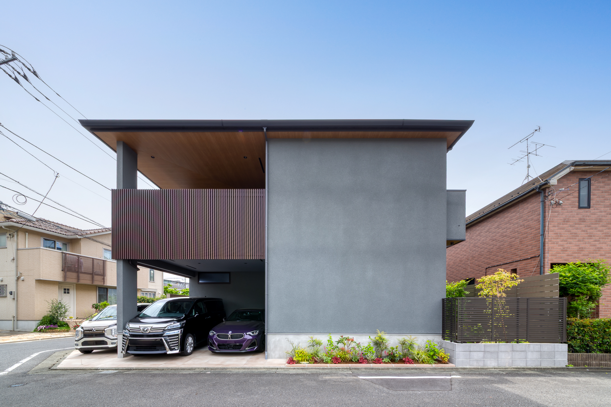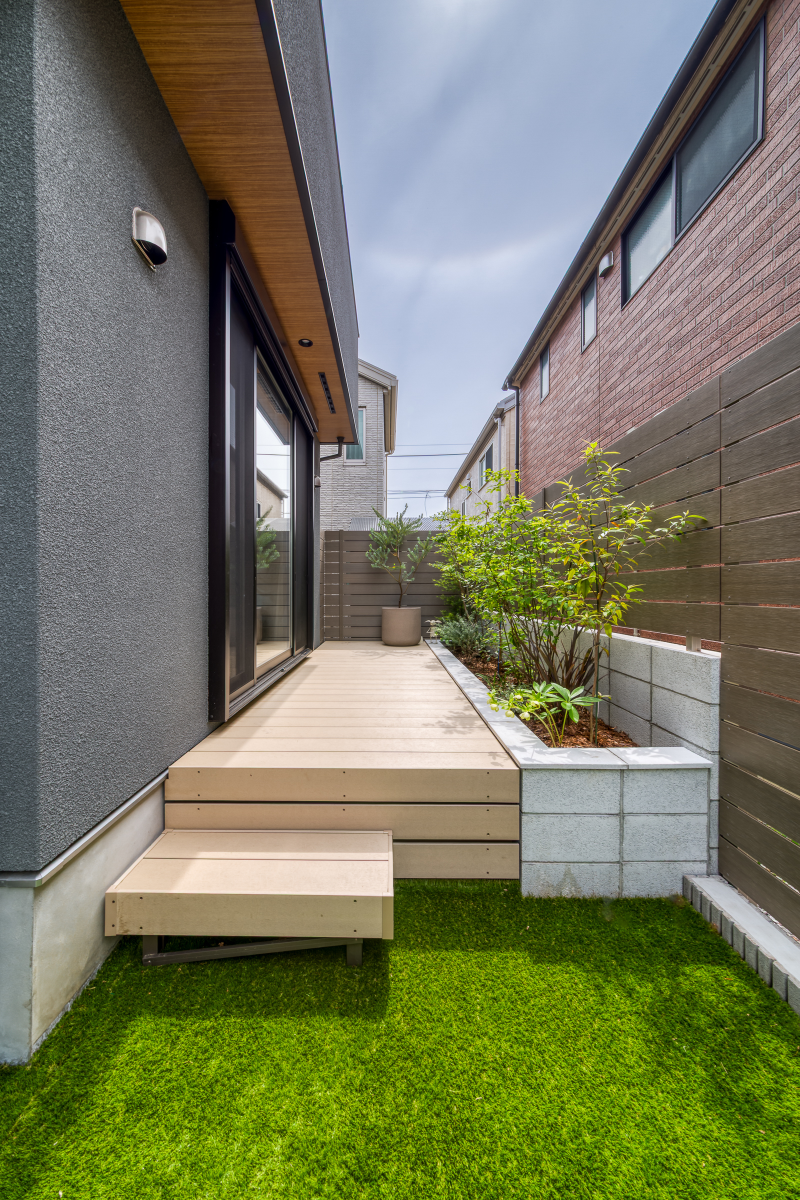 花壇・人工芝・デッキを一体で計画することで、暮らしやすさとデザイン性を両立。家族の趣味やライフスタイルに合わせ、庭の活用シーンが自然に広がる空間となりました。夜間には外壁に美しい影を映し出し、ファサード全体を格調高く演出します。