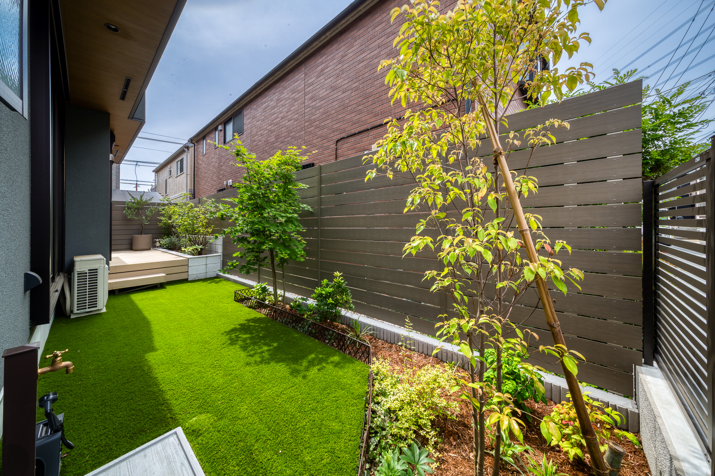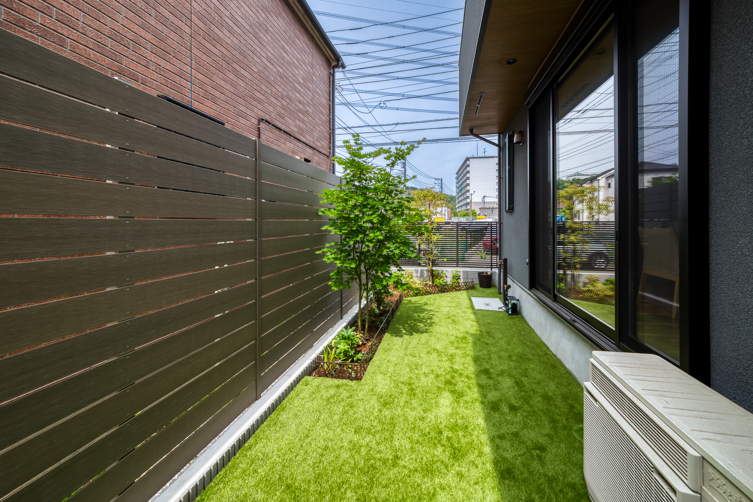 庭空間は人工芝をメインに構成。愛犬がのびのびと走り回れるスペースとして設計しました。お子様やご家族にとっても、安心して過ごせる庭時間が広がります。