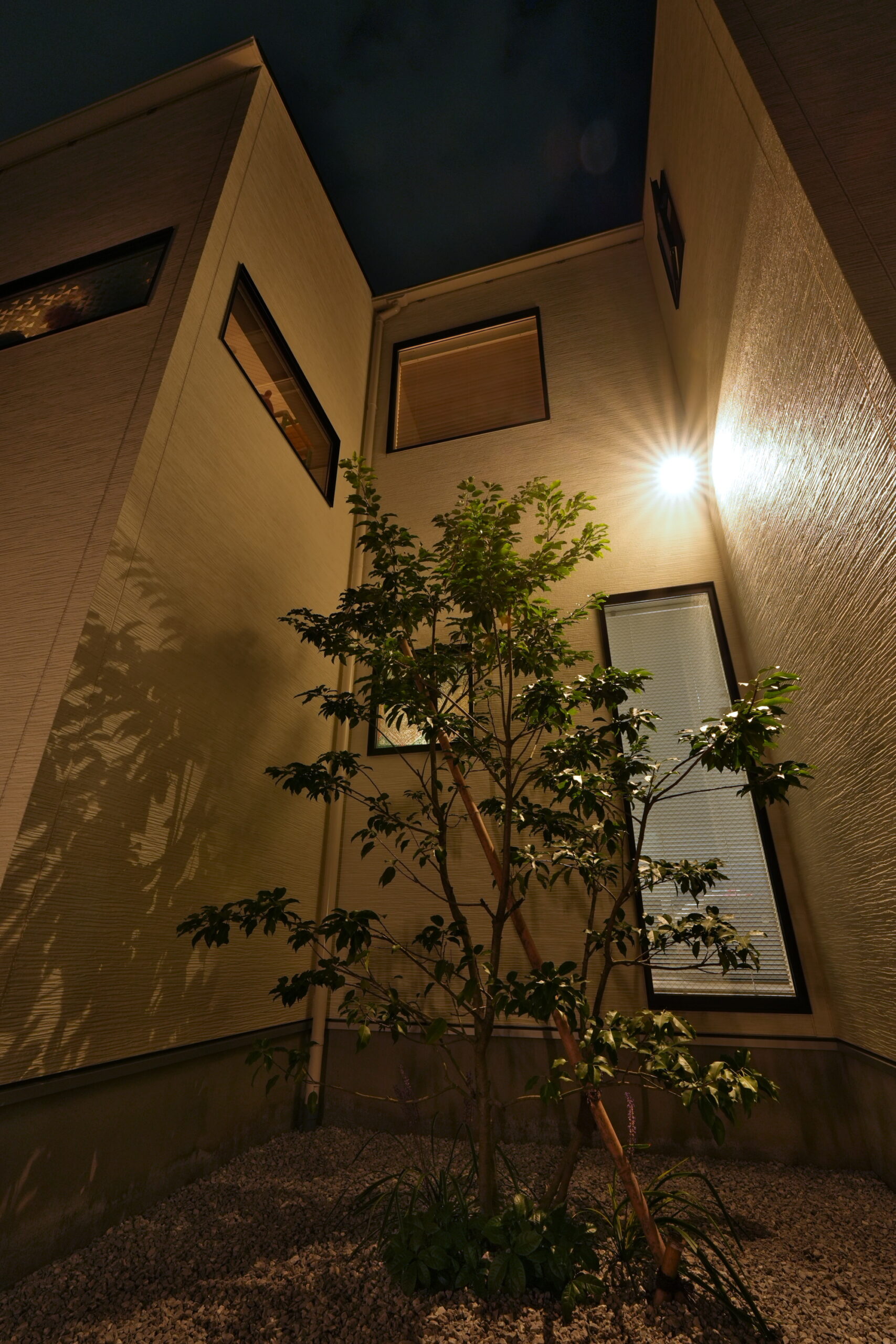植栽と照明の組み合わせは、日中のグリーンと夜の陰影という、二つの表情を住まいにもたらしてくれます。