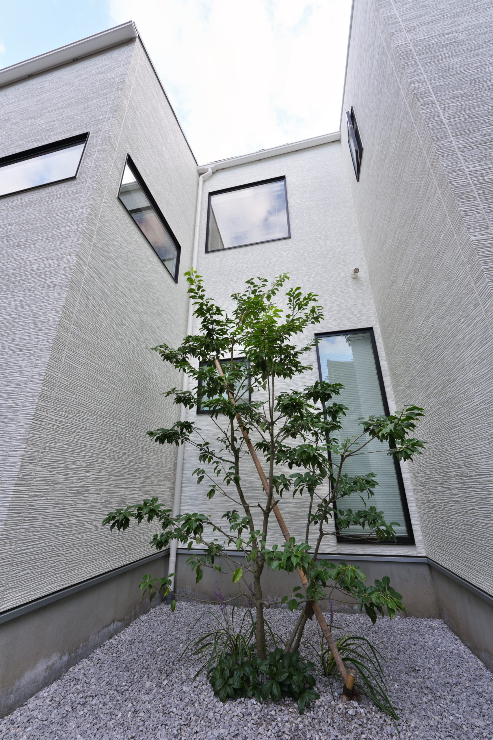 門袖前やアプローチ脇には植栽スペースを設け、夜には樹形を際立たせるライティングを施しています。