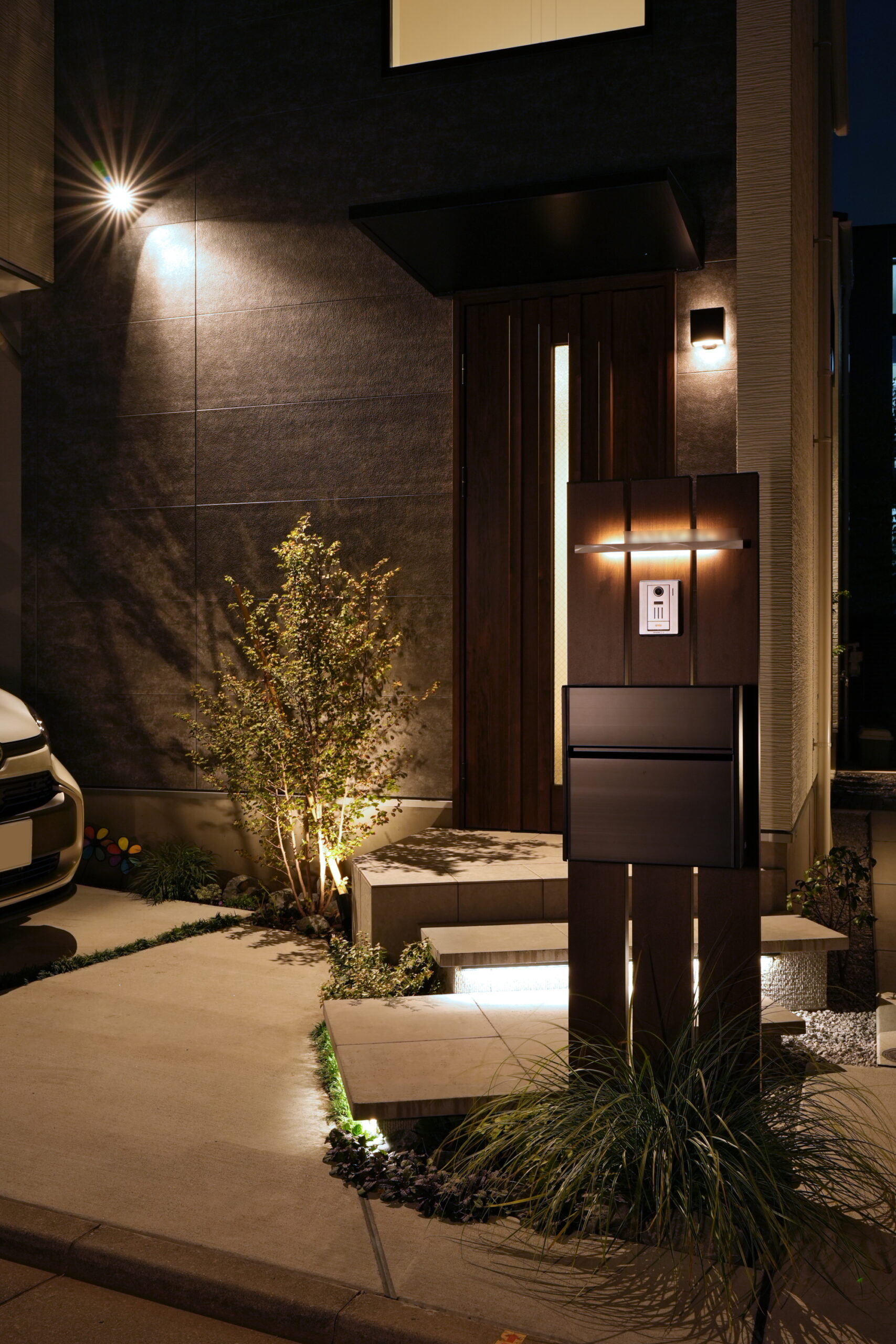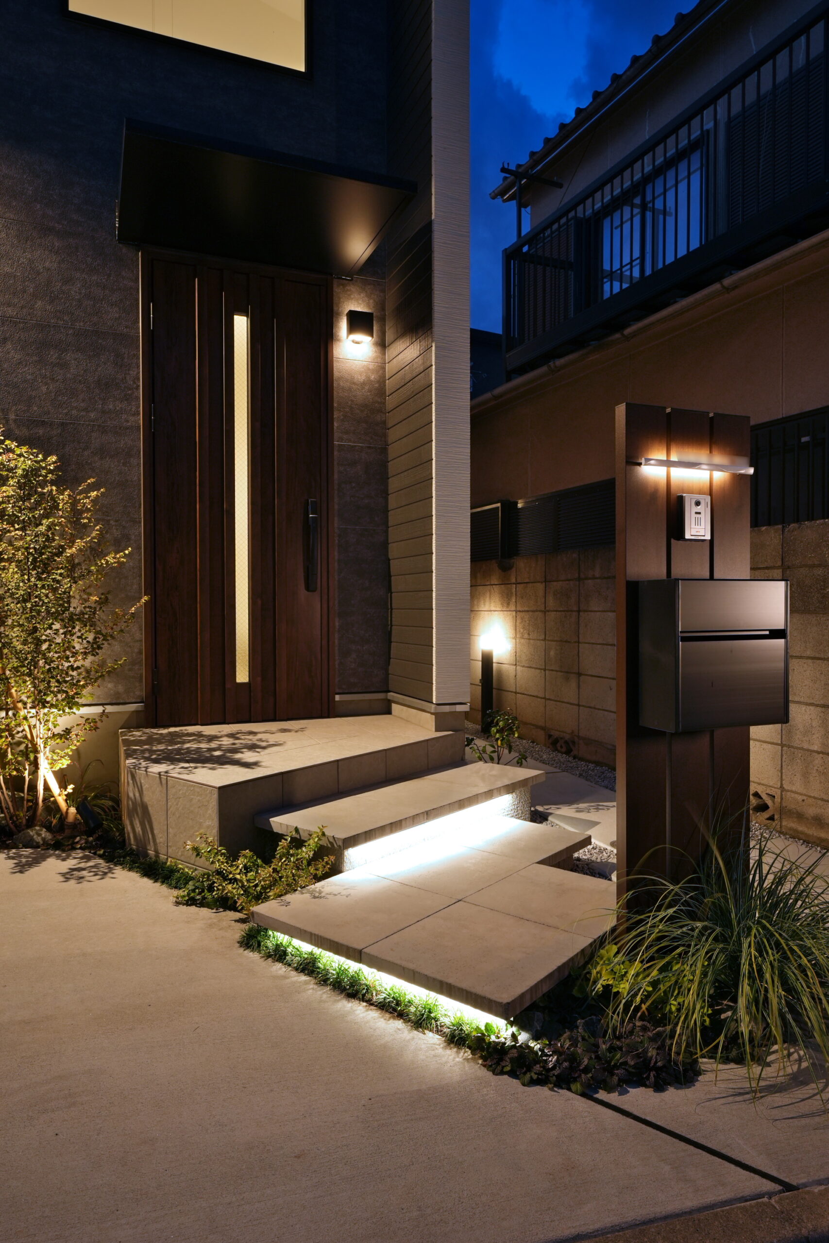 玄関までのアプローチには、足元をやわらかく照らす照明をバランスよく配置しています。