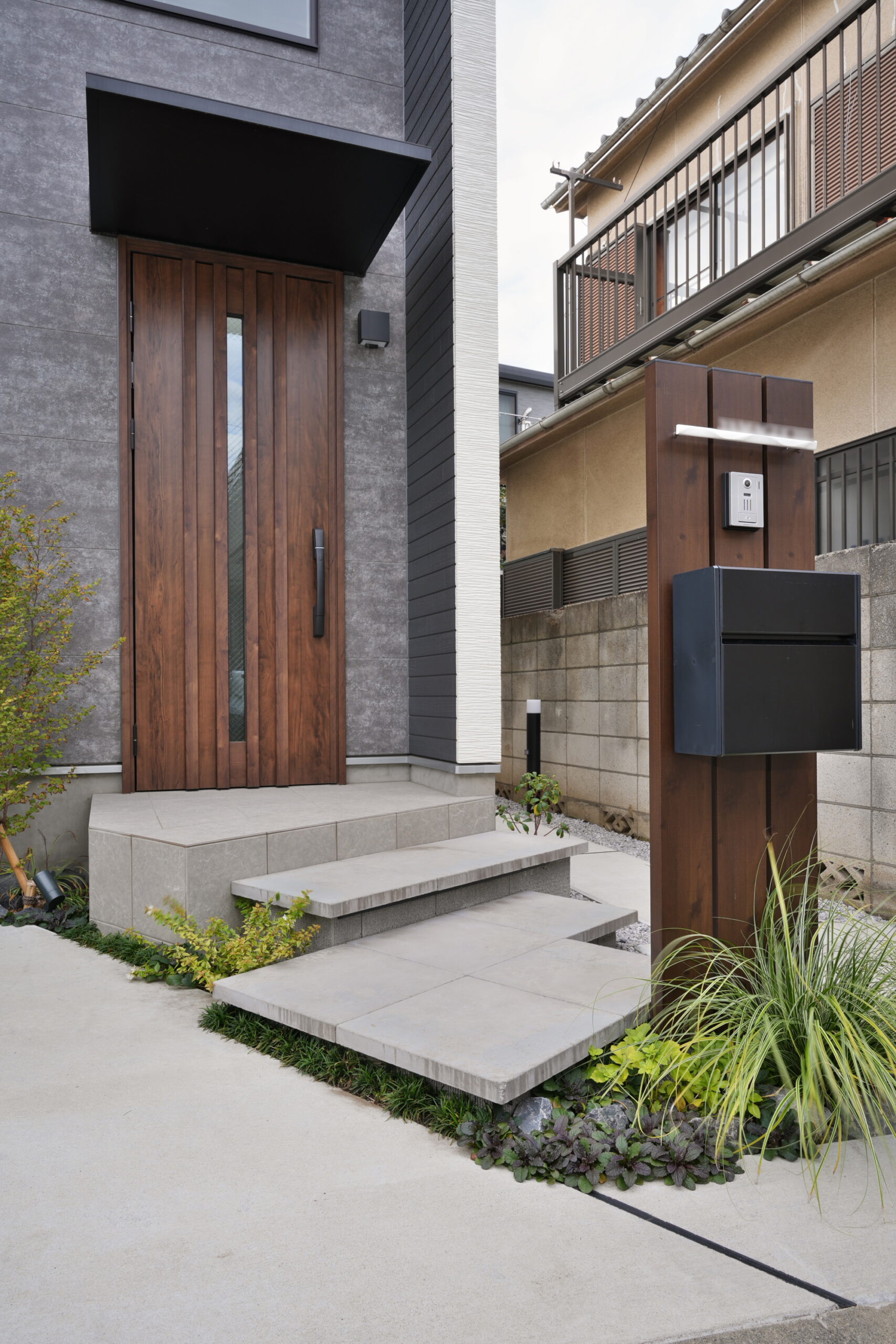 玄関へ向かう動線が光の流れとして視覚化されることで、帰宅や来客の際に「迎え入れられている」ような温かみを感じられる外構となりました。