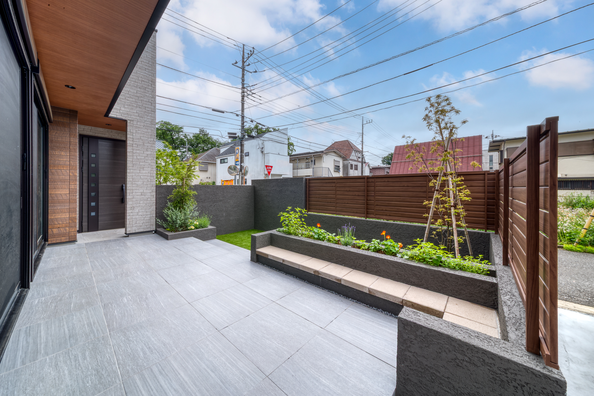 ・広いタイルテラス+備え付けベンチとハーブ花壇で家族の暮らしを彩る設計