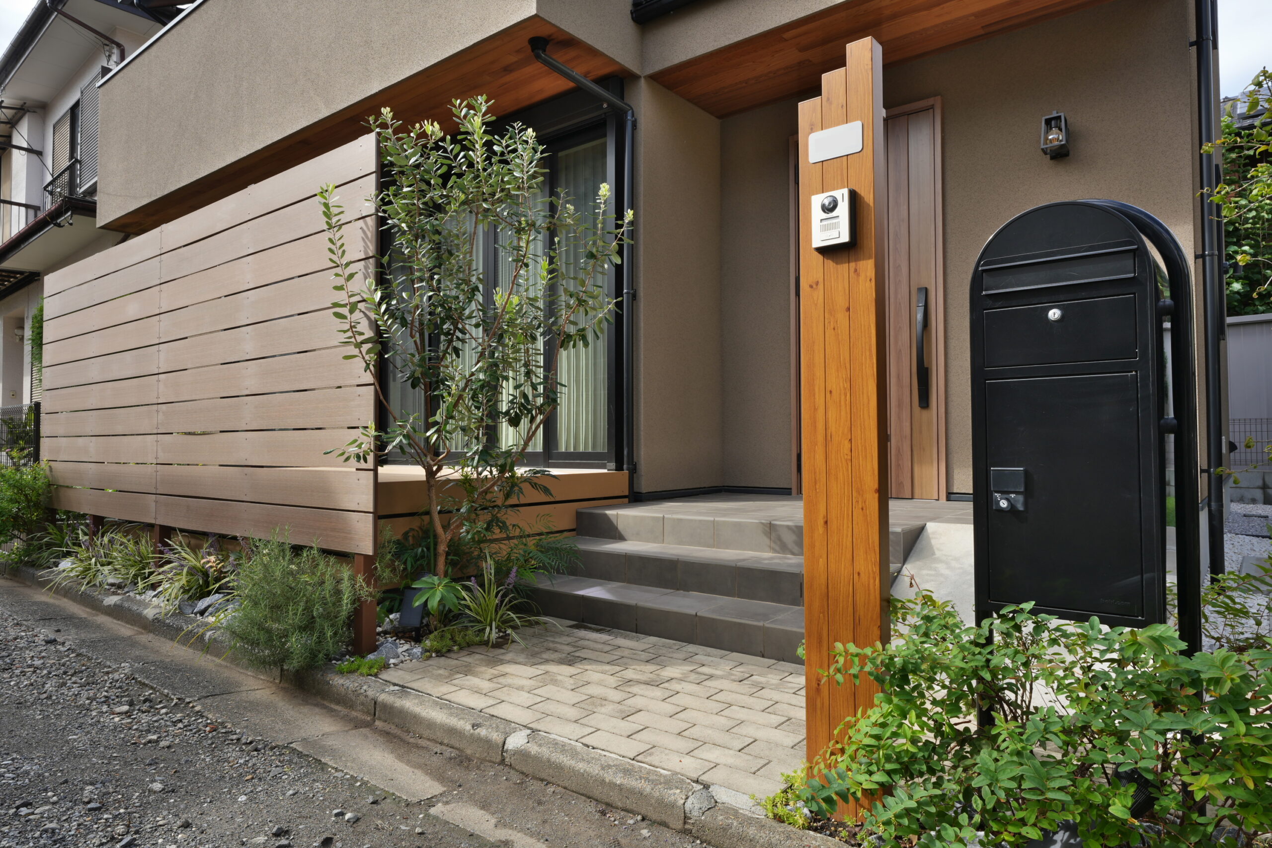 直線的な外構ラインの中に、葉や枝のやわらかな表情が加わることで、全体の印象が穏やかになり、毎日目にしても飽きのこないファサードになります。