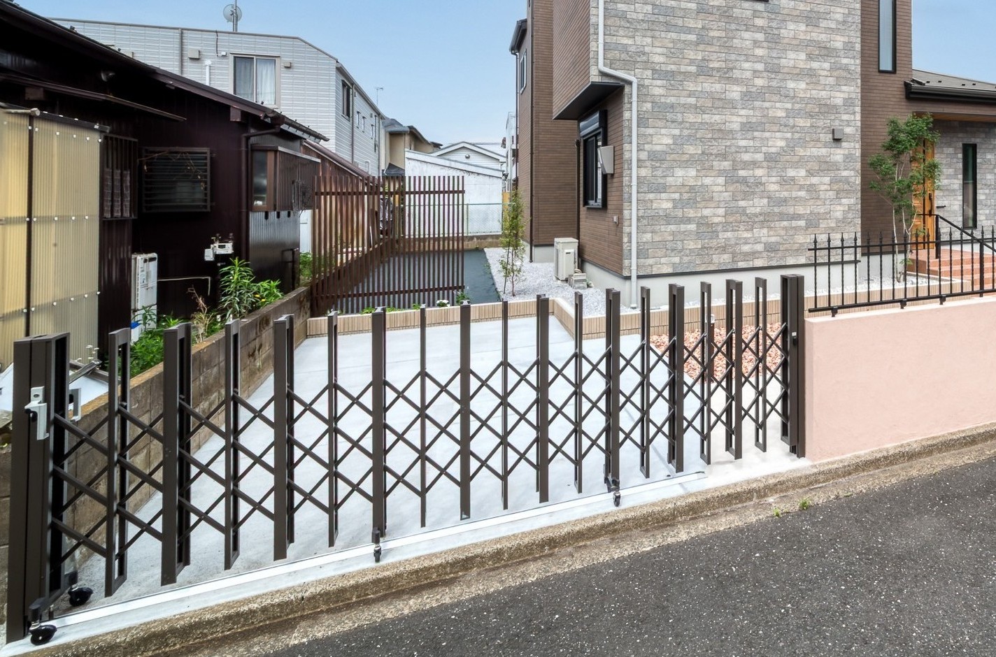 道路側はアルミ鋳物の門扉とフェンスを三協アルミ「キャスタイル1型」で統一。シンプルな直線デザインが住まいと調和し、プライバシーを守りながらも開放感を残した外構に仕上がりました。駐車スペースにはLIXIL「アルシャインⅡH型」を採用し、スムーズな開閉と安心の動線を確保しています。