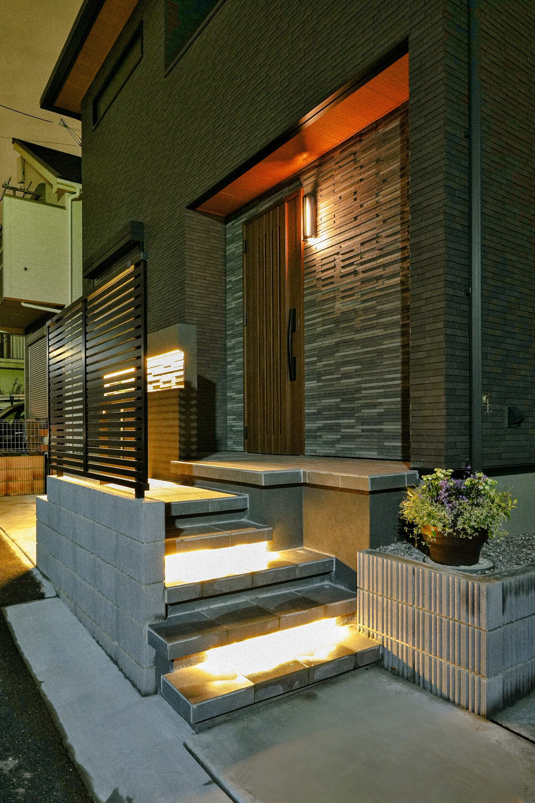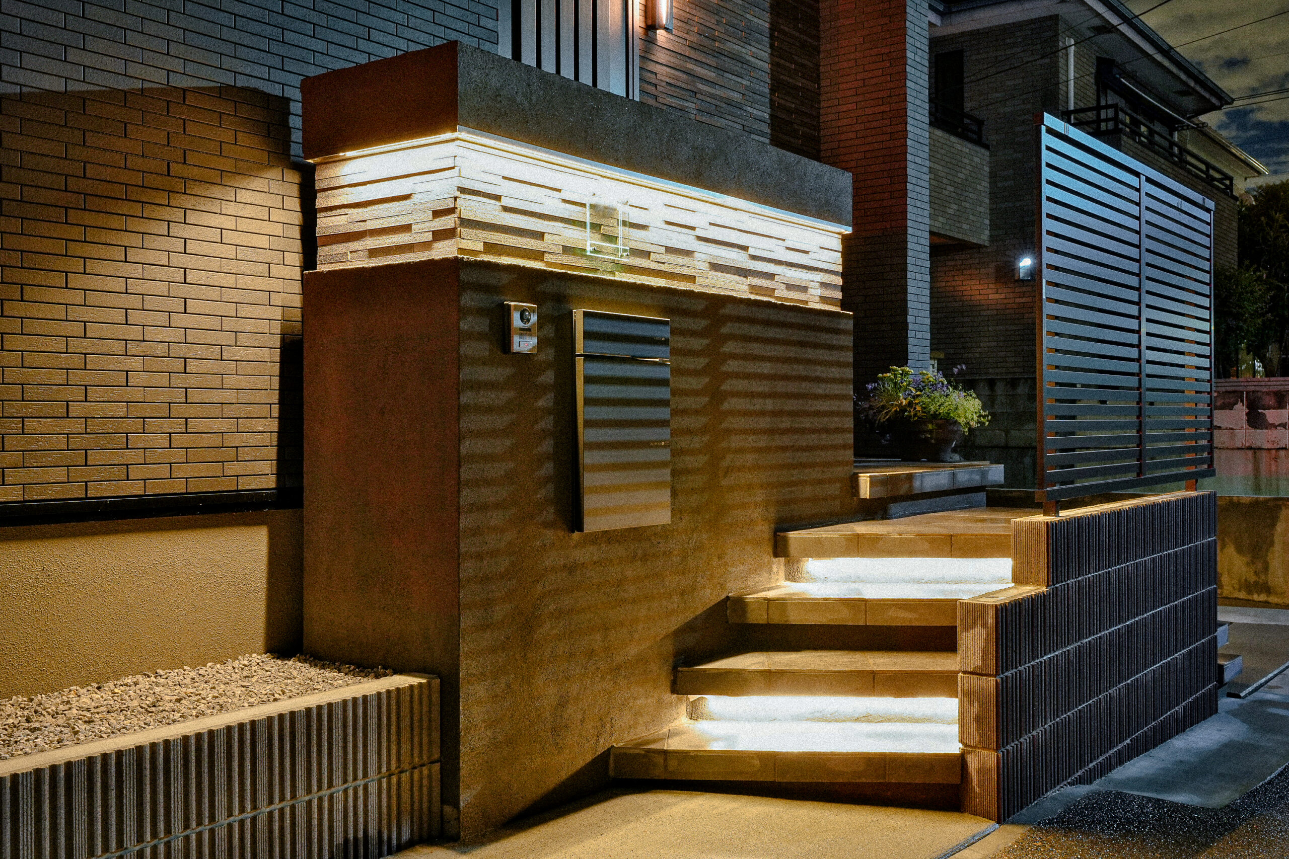 安全性を高めながらも、玄関まわりを美しく照らし出す外構デザインとなっています。