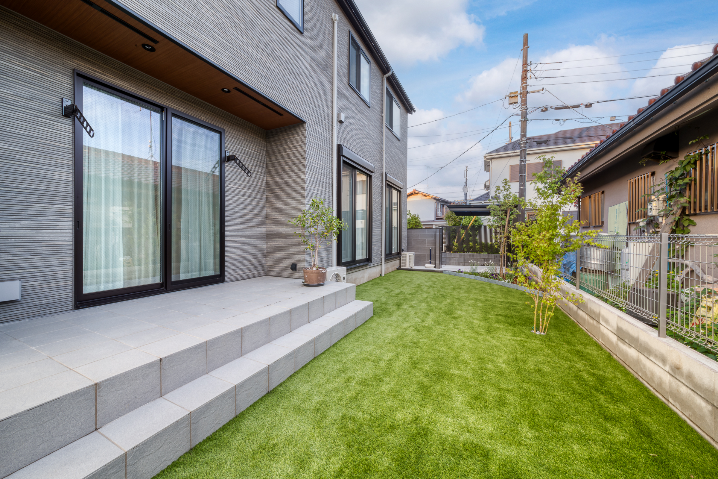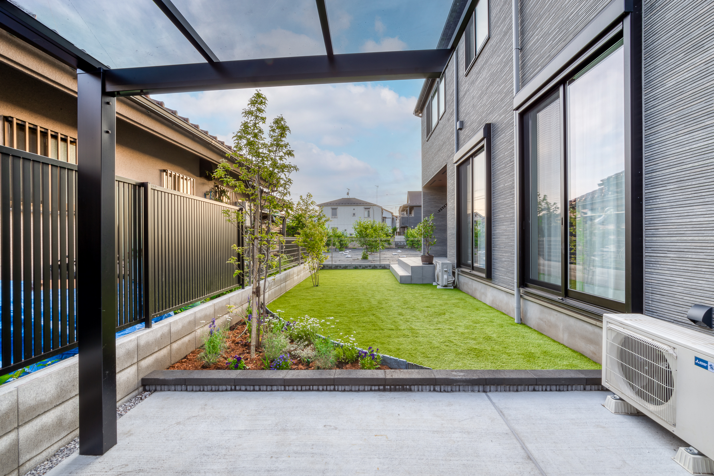 子どもが走り回れる人工芝と緑の演出