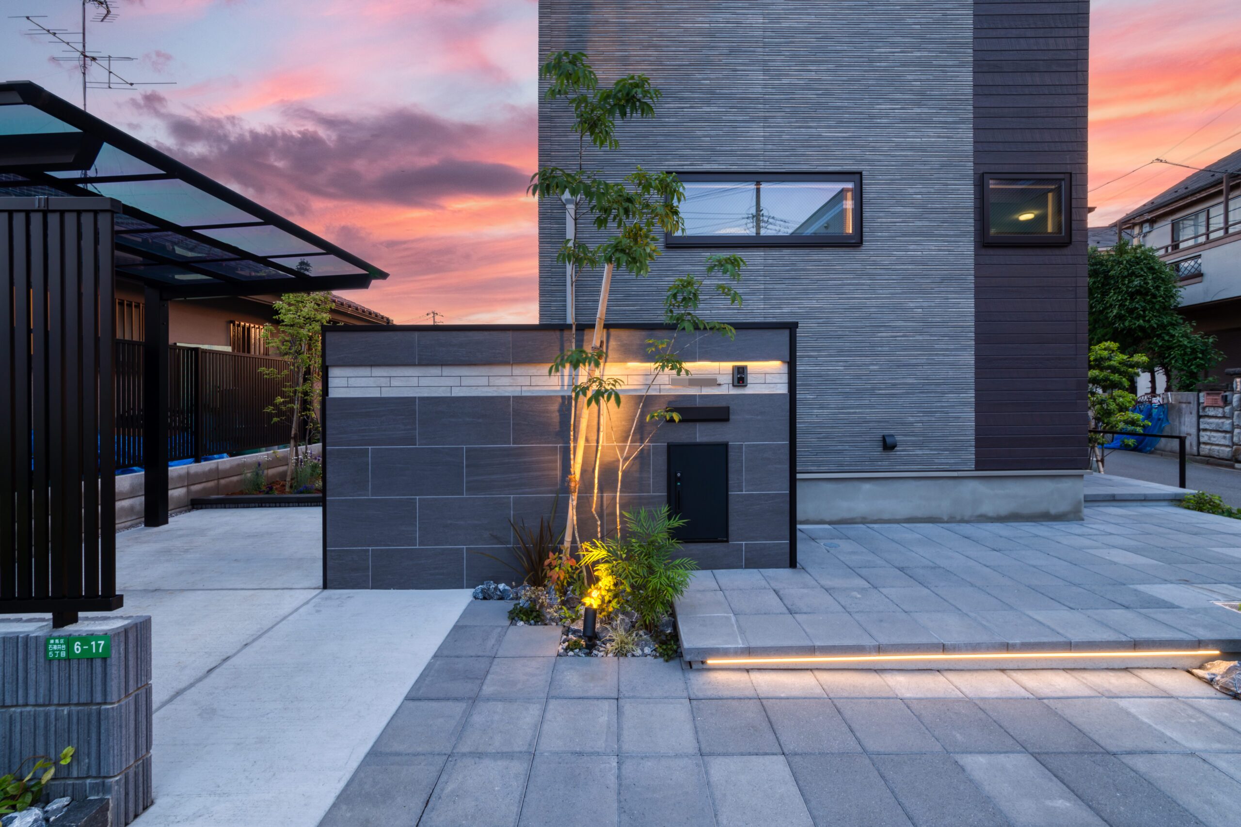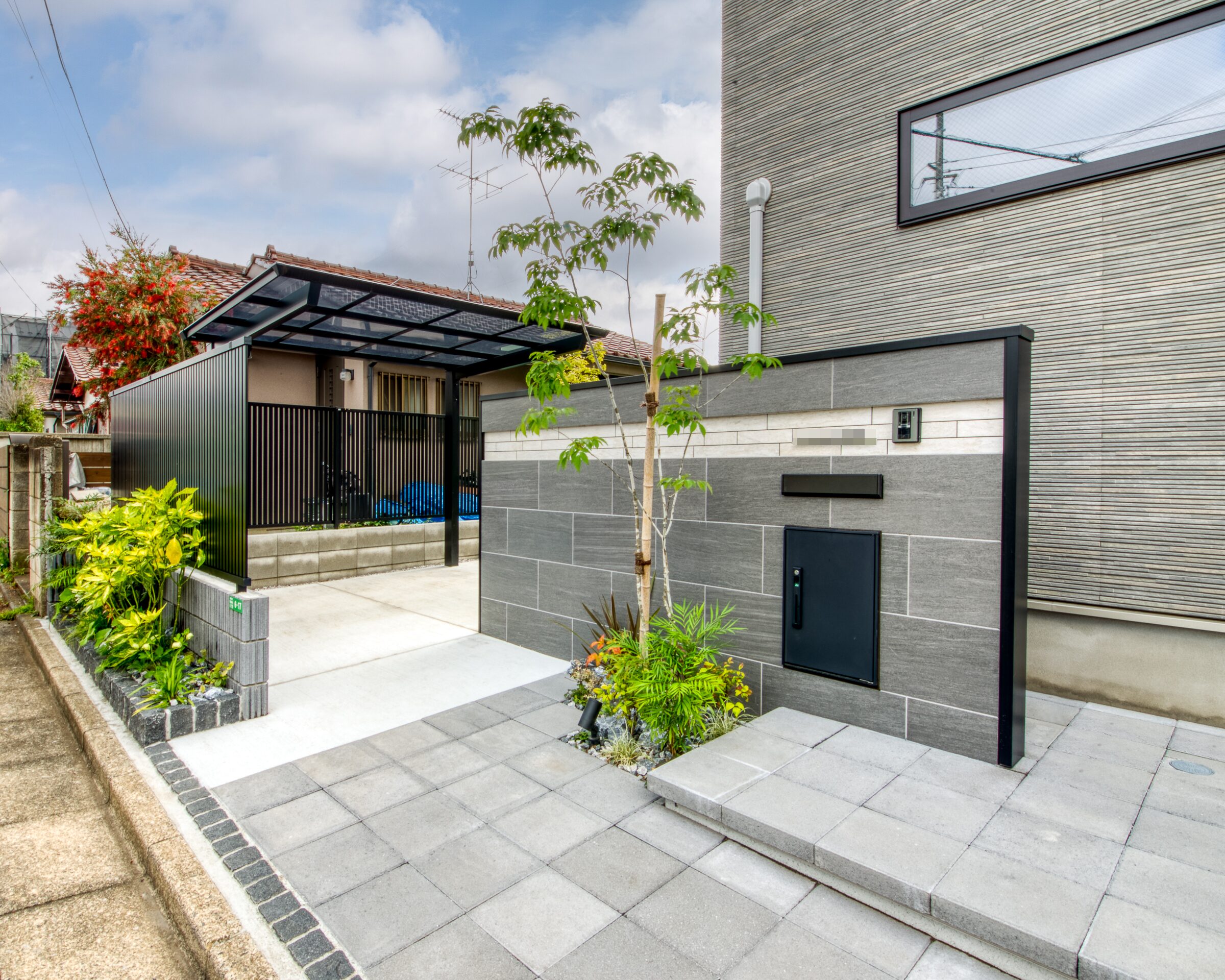 造園 / 植栽 / 人工芝 / ロックガーデン / モダン外構デザイン / 門塀 / 表札 / ポスト / 宅配ボックス / インターホン設置 / アルミ形材フェンス / アプローチ / アプローチ階段 / 土間コンクリート / インターロッキング / サイクルポート / 立水栓 / 照明(スポットライト) / ゴロタ石 / 花壇 / シンボルツリー植栽
