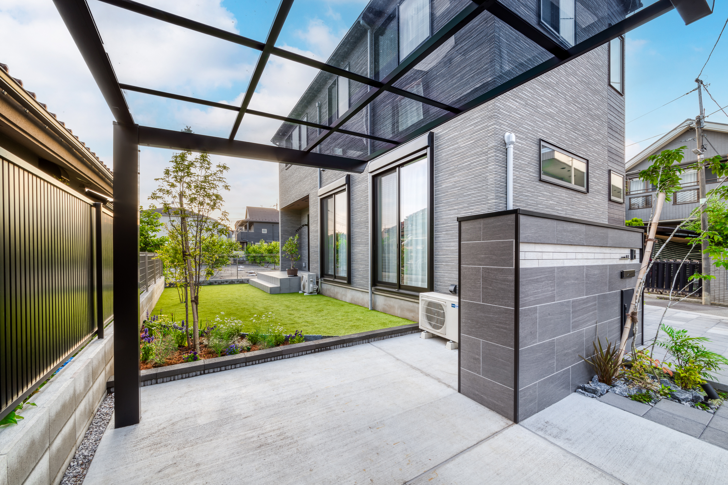 家事・育児・防犯すべてをスマートに支える要素を盛り込んだ、機能美あふれる外構となりました。